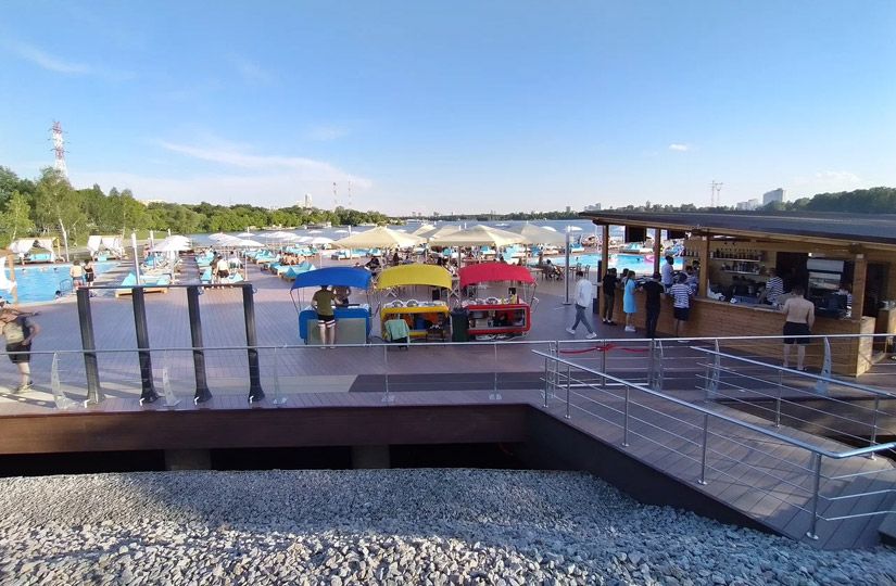 Пляж Северного речного вокзала открылся всего год назад и точно понравится любителям городского отдыха. Он может похвастаться зоной отдыха с бассейнами с подогревом, современными лежаками и кабинками, красивой набережной с ресторанами и потрясающим видом на Химкинское водохранилище.