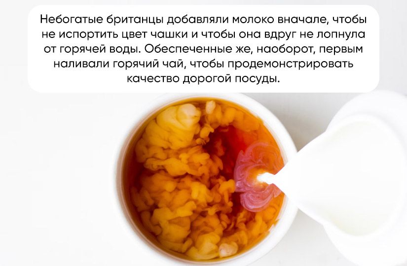Считается, что молоко в чай британцы стали добавлять для того, чтобы не портить свой дорогой фарфор. Но мало кто знает и еще один интересный факт: даже в самой Англии долгое время шли споры, что наливать в чашку сначала – молоко или чай. Мы-то все слышали версию про молоко, ведь, согласно историкам, его наливают первым, чтобы уберечь посуду от повреждений (трещин от кипятка и загрязнения красящими веществами, содержащимися в черном чае). Но тут все гораздо сложней. Да, молоко защищает фарфор, и в домах попроще его действительно добавляли перед тем, как налить чай.