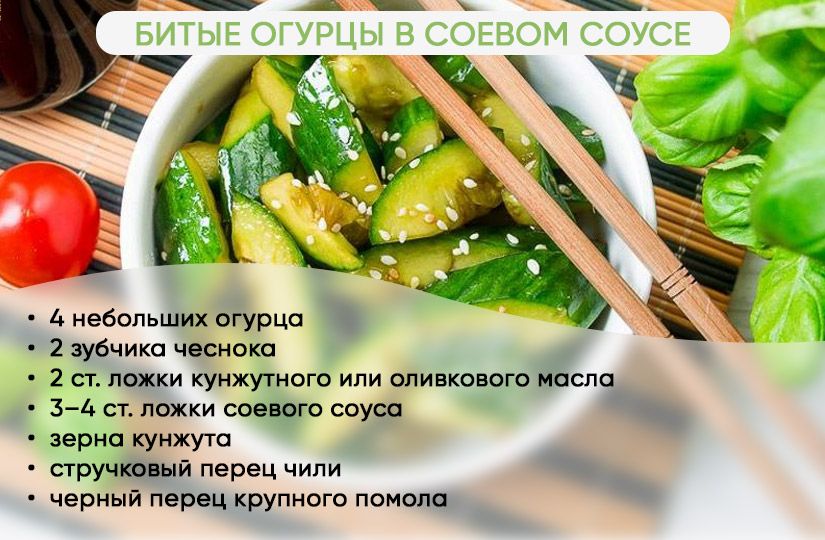 Выложите огурцы с отрезанными хвостиками на разделочную доску и поочередно раздавите большим широким ножом, как давят чеснок. Или воспользуйтесь колотушкой для мяса, положив огурцы в полиэтиленовый пакет. Затем каждый огурчик разрежьте на три части и отправьте в салатную миску. Туда же добавьте перец чили, нарезанный тонкими кольцами (достаточно 2–4 колечек), и мелко нарубленный чеснок. Для заправки смешайте соевый соус, масло и черный перец. Охладите закуску в холодильнике. Перед подачей посыпьте поджаренным кунжутом.