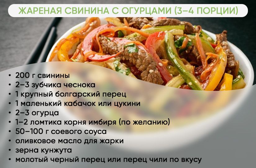 Нарежьте мясо тонкими длинными полосками и обжарьте, постоянно помешивая. Когда оно схватится, добавьте рубленый чеснок и один-два слайса имбиря, раздавленного ножом. Перемешайте, добавьте нарезанный кольцами болгарский перец, поперчите. Когда блюдо будет почти готово, положите в вок тонкие длинные ломтики кабачка и огурцов и залейте все соевым соусом. Перемешивая, потушите еще 3–4 минуты, посыпьте жареным кунжутом и снимите с плиты.