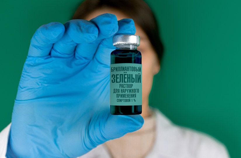 Знакомая всем зеленка — это раствор бриллиантового зеленого, синтетического анилинового красителя. Многие думают, что она запрещена во всем мире, кроме стран СНГ, но это не совсем так. Правильнее сказать, что зеленка не используется в зарубежной практике из-за сомнительных эстетических свойств и отсутствия серьезных исследований (в том числе на канцерогенность). Но ее точно никто не запрещал.