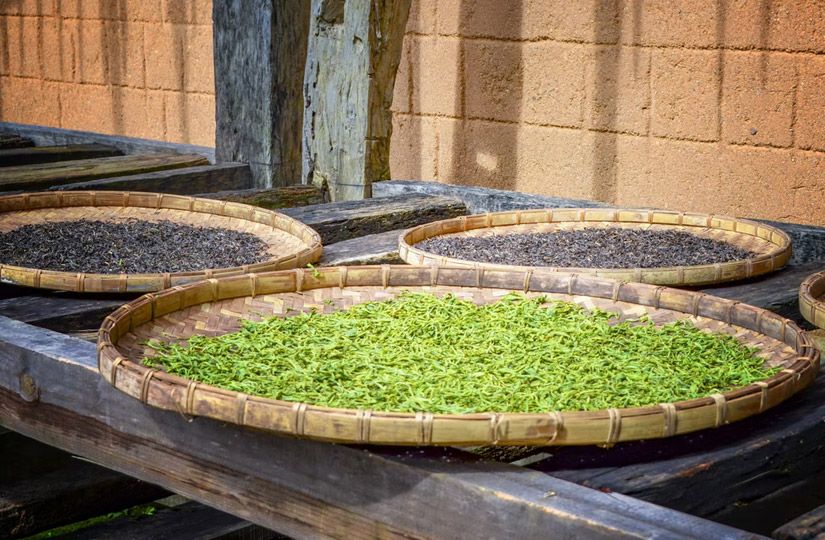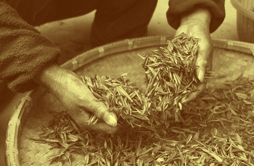 Готовое сырье сортируют, разбирая на четыре категории: чайная пыль, мелкая крошка, крупные обломки, цельные листья.