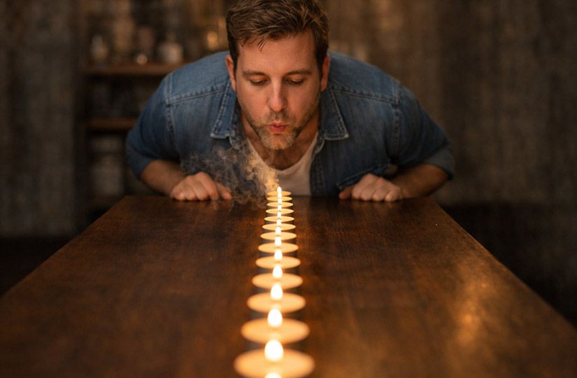 На большой стол выставите в длинный ряд зажженные чайные свечи. Задача игрока — встать перед ними и затушить как можно больше свечей на выдохе, громко произнося какую-нибудь фразу или пожелание. Например: «Желаю хорошего года!», «Кайфуйте! Жизнь одна!» или «Мы счастливы!». Сделать это не так-то просто, поэтому задувший все свечи точно должен заслужить приз.