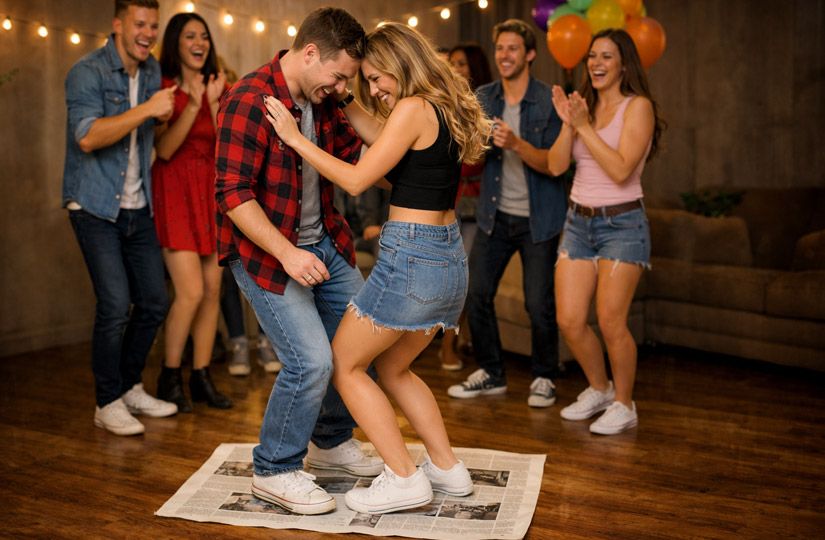 Если у вас вечеринка для парочек, то танцевать на одной газете можно по двое, в разношерстной компании лучше танцевать в одиночку. Чтобы гости не стеснялись, а игра прошла веселее, сделайте сразу несколько бумажных танцполов и подберите тематическую музыку из любимых фильмов или танцев, завирусившихся в этом году.
