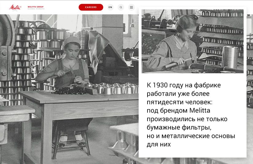 Спрос на новый товар неуклонно рос, поэтому в 1914 году крошечное семейное производство трансформировалось: компания переехала в отдельную мастерскую, наняла пятнадцать работников и приобрела мощное производственное оборудование. В 20-е годы Мелитта придумала новаторскую для того времени рекламу: кофе заваривали с помощью ее фильтров прямо в магазинах бытовой техники.