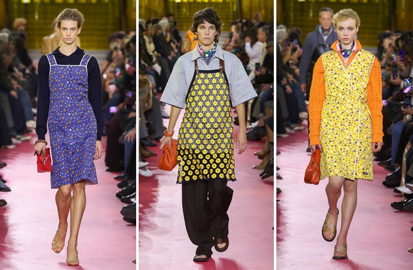 Фартуки и халаты в цветочек — хит коллекции Miu Miu. На подиуме модели выглядели так, словно совершили дерзкий налет на склад ивановского трикотажа. Участницы дефиле вышли в намеренно диссонирующих образах, собранных из деталей, которые, на первый взгляд, совершенно не сочетаются. Наряды будто достали из бабушкиного шкафа, но именно в этом и заключалась задумка дизайнера. И хотя Миучча Прада вряд ли курсе, в каких халатах любят ходить русские женщины категории 60+, попадание в нашу эстетику оказалось стопроцентным.