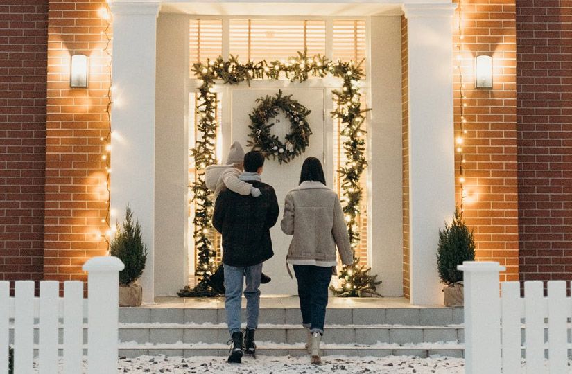 Рождественский венок проще всего купить уже готовый и дополнить любой гирляндой по вашему вкусу. Для двери выбирайте вариант на батарейках.