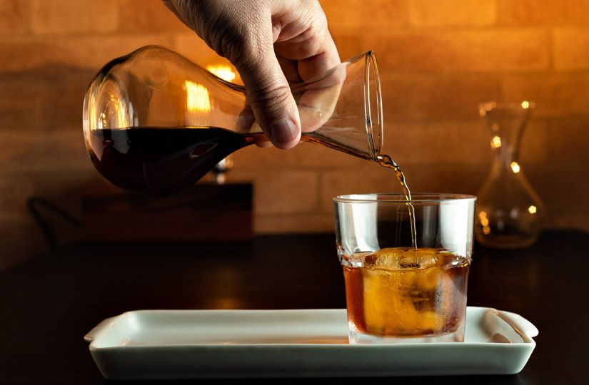 Очень необычный кофе, приготовленный по методу холодной экстракции. 100–150 грамм молотого кофе заливается 1 литром воды и убирается в холодильник на 12 часов или даже на сутки. За это время происходит экстракция и на выходе получается насыщенный кофеином и эфирными маслами, но при этом достаточно легкий и свежий напиток без горечи и яркой кислинки.