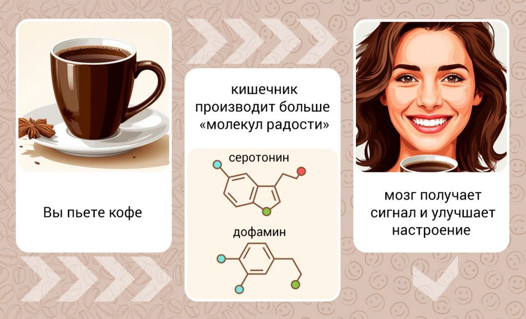 В нейробиологии существует такое интересное понятие, как ось «кишечник — мозг». Его смысл прост: все, что происходит в пищеварительной системе, напрямую влияет на наши эмоции. И тут кофе делает шаг вперед.