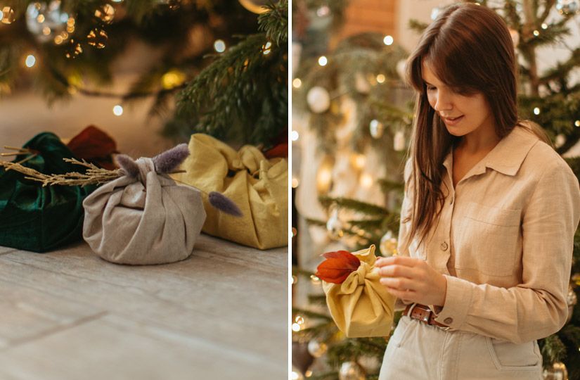 Если мысль об умножении пластика в мире повергает вас в печаль, используйте старый добрый метод, проверенный столетиями: заворачивайте подарки в отрезы ткани. В интернете можно найти множество подсказок, как это сделать красиво. Кстати, именно ткань тоже идеально подходит для нарядной упаковки бутылок.