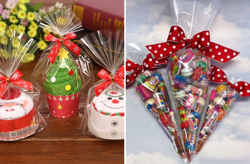 Не самый экологичный, зато эффектный способ придать подарку нарядный и дорогой вид. Пленку удобно использовать для предметов нестандартной формы — бутылок, маленьких корзинок со сладостями, наборов косметики и особенно для домашних сладостей. Найти ее можно в любом цветочном магазине или на маркетплейсах. Для небольших подарочков (конфеты, носки, мыло) больше подойдут уже готовые пакетики из прозрачной пленки. Останется только красиво обвязать их лентой.
