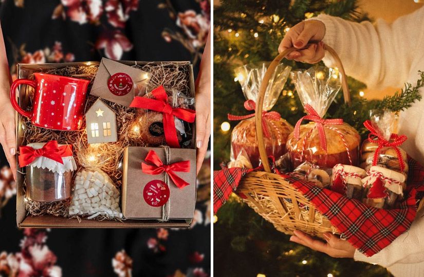 Плюс корзинки и коробки в том, что вложить в них можно почти все, если только это не огромный набор лего. Впрочем, такое оформление подарка лучше оставить для взрослых, как и крафт. Оно идеально подходит для тематического новогоднего набора: например, косметики, продуктов, сладостей или уютных вещей для дома.