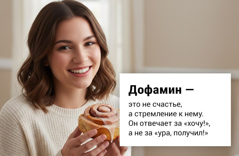 Дофамин — нейромедиатор предвкушения и мотивации, а не само удовольствие. Он создает то электризующее чувство, когда десерт только несут к столу, но быстро исчезает, когда первый кусочек оказывается во рту.