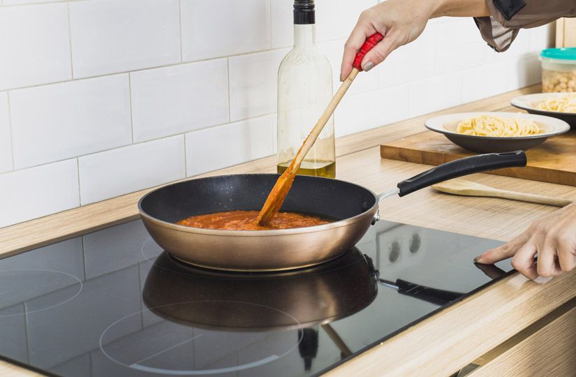 В индукционных панелях электрический ток подается не на нагревательный элемент, а на катушку, генерирующую электромагнитное поле. Индукционная плита «включается» только после того, как на нее поставят специальную посуду из ферромагнитного материала: в дне сковородок и кастрюль начинают активироваться переменные (или вихревые) токи Фуко. При этом варочная поверхность сама по себе не греет: приготовление пищи происходит именно за счет нагрева посуды. Таким образом, потеря тепловой энергии стремится к нулю.