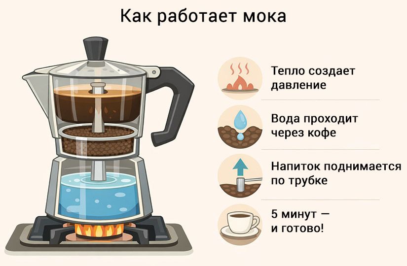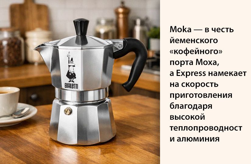 Однажды итальянский литейщик Альфонсо Биалетти наблюдал за женой, стирающей белье в популярной в 1930-е годы «машинке». Устройство было нехитрым: мыльная вода в нижнем баке закипала, под давлением поднималась по трубке вверх и орошала белье. Альфонсо понял, что этот же принцип можно использовать для приготовления кофе, и в 1933 году запатентовал алюминиевую Moka Express.