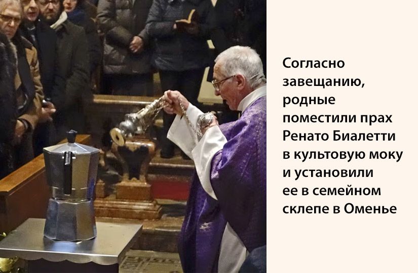 16 февраля 2016 года в итальянском городке Казале-Корте-Черро состоялось необычное прощание с усопшим: прах Ренато Биалетти поместили не в урну, а в гейзерную кофеварку на 24 чашки…