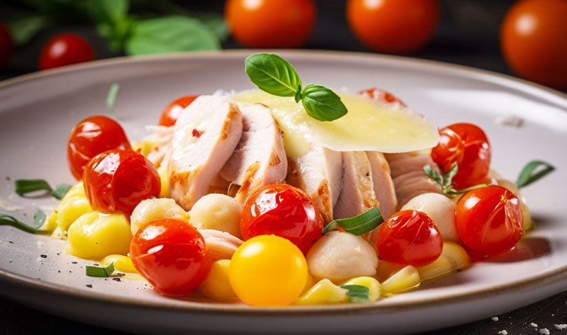 Конкилье с копченой индейкой, моцареллой и помидорами черри