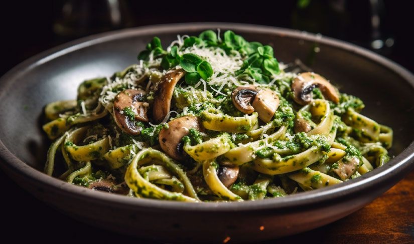 На одну порцию: 80 г феттучини, 20 г пармезана, два крупных шампиньона (или горсть белых грибов), готовый соус песто в банке (понадобится две столовые ложки), свежемолотый черный перец, соль.