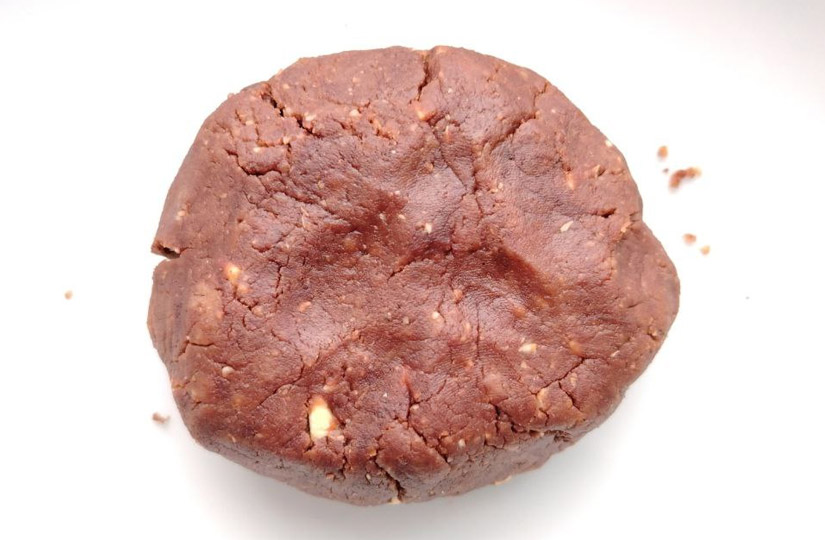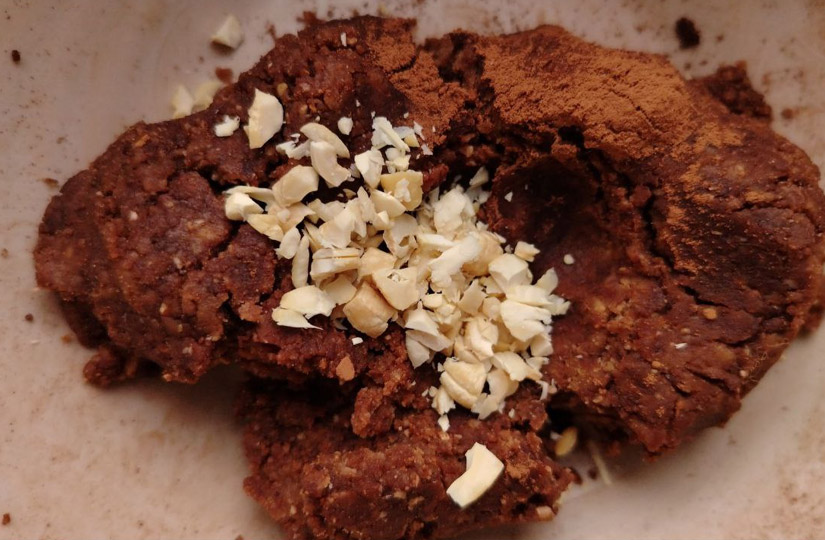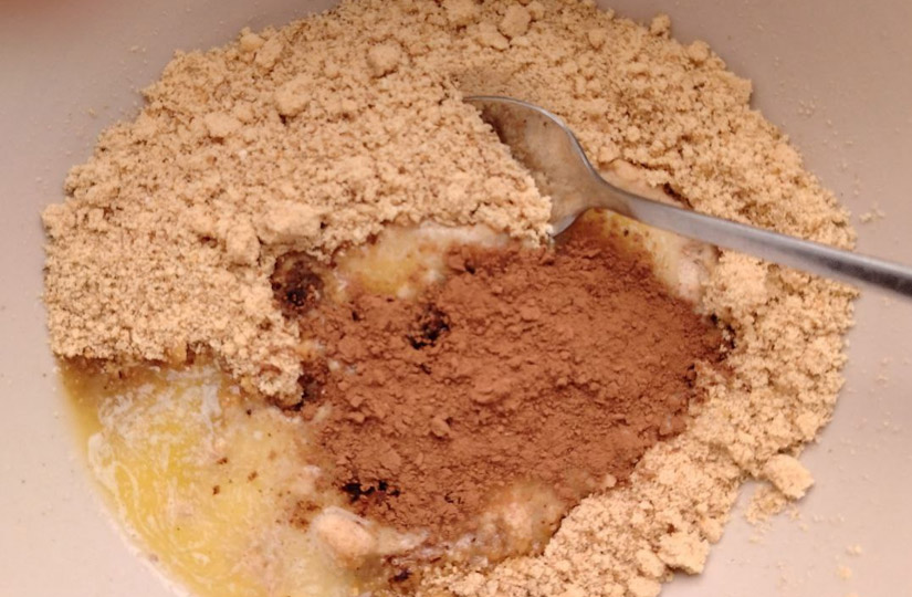Добавьте молоко, какао, пряности, дробленые орешки и растопленное сливочное масло. Тщательно перемешайте. Масса должна получиться пластичной.