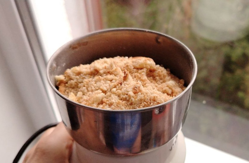 Разломайте печенье на несколько частей и с помощью блендера измельчите до такого состояния, когда оно станет больше похоже на муку, чем на крошки.
