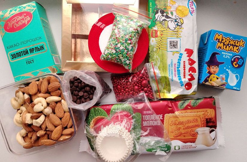 Главный секрет успеха — нарядность подарка, поэтому обязательно добавьте к набору ингредиентов два-три вида посыпок в новогоднем стиле, а также купите яркие мини-коробочки с ячейками, бумажные розетки и упаковочную ленту.