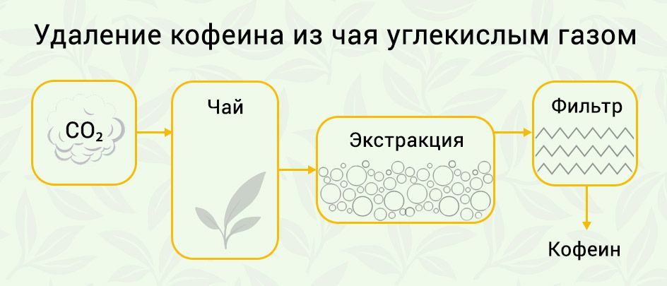 Из чая кофеин удаляют с помощью химических реагентов или углекислого газа. В первом случае чайные листья обрабатывают паром и замачивают в этилацетате или метиленхлориде — веществах, которые вытягивают кофеин. Получившийся раствор сливают, а листья очищают от реагента и высушивают.