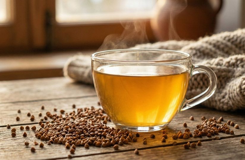 Если зерна гречихи уже были подвергнуты обжарке, их можно заваривать сразу – 1 ч.л. на 1 стакан кипяченой воды, остывшей до 90 градусов. Настой разливают по чашкам через 3-4 минуты. Сырые зерна следует предварительно обжарить, а потом следовать той же схеме.