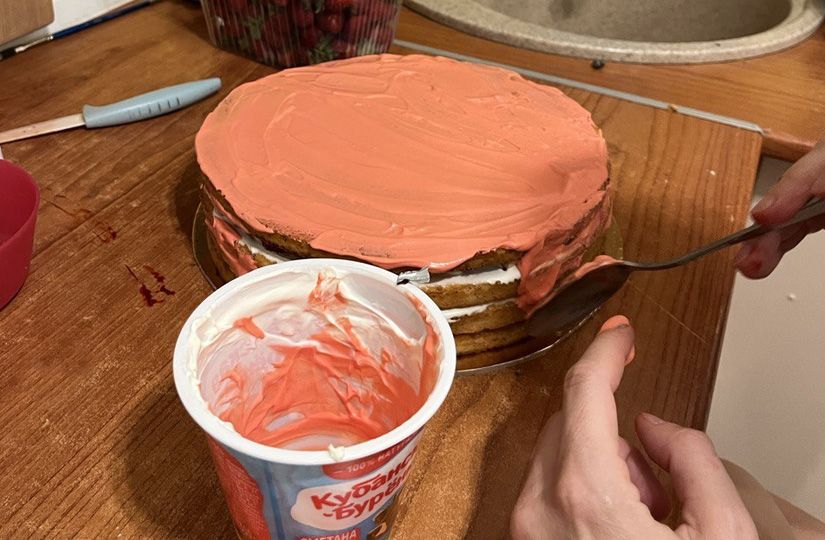 3. Когда башня из коржей будет готова, приступайте к самому ответственному моменту — обмазыванию торта кремом. Здесь идеально подойдет 25–30% сметана, которая ложится на торт ровно, совсем как в настоящей кондитерской мастерской. Пользуйтесь для этого широкой лопаточкой. Следите за тем, чтобы все щели между коржами были хорошо заполнены.