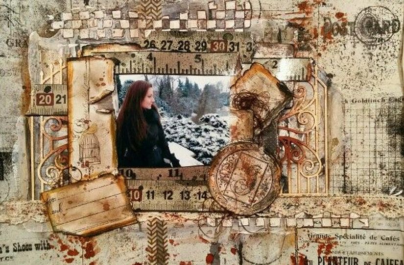 Полная противоположность шебби-шику. Здесь будут темные тона, «грязь», много крафт-бумаги, черные чернила, потертости и рваные края. В этом истинно мужском стиле можно использовать шестеренки и другие плоские детали от механизмов, а также металлические или похожие на металл элементы декора. Многим мастерам нравится искусственно состаривать некоторые части композиции.
