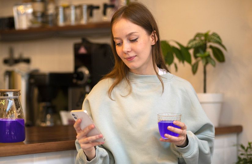 - Долейте к ней еще 150 мл горячей воды или согретого молока. Первый вариант будет менее калорийным, а второй превратит напиток в синий капучино. Особенно если добавить к нему капельку сиропа и щепотку корицы.