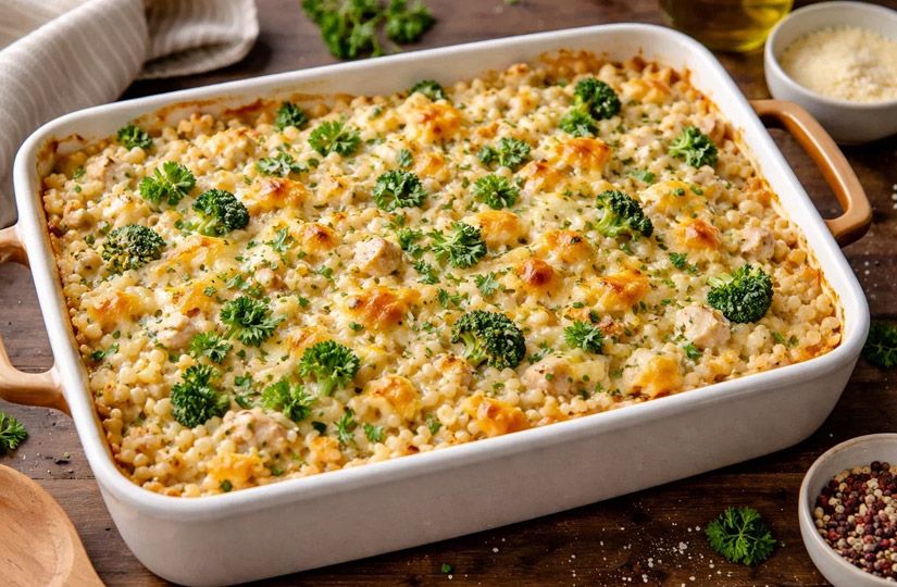 Приготовьте бешамель или любой сливочный соус. Добавьте по вкусу тертый сыр и птитим, чтобы получилась густая масса. Выложите в форму и выпекайте до золотистой корочки.