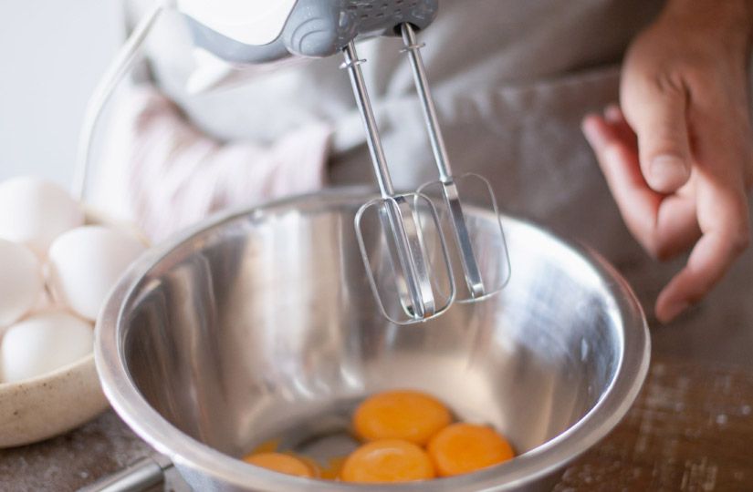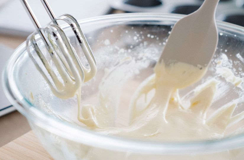 - Взбивайте смесь миксером на низкой скорости, тонкой струйкой вливая масло.