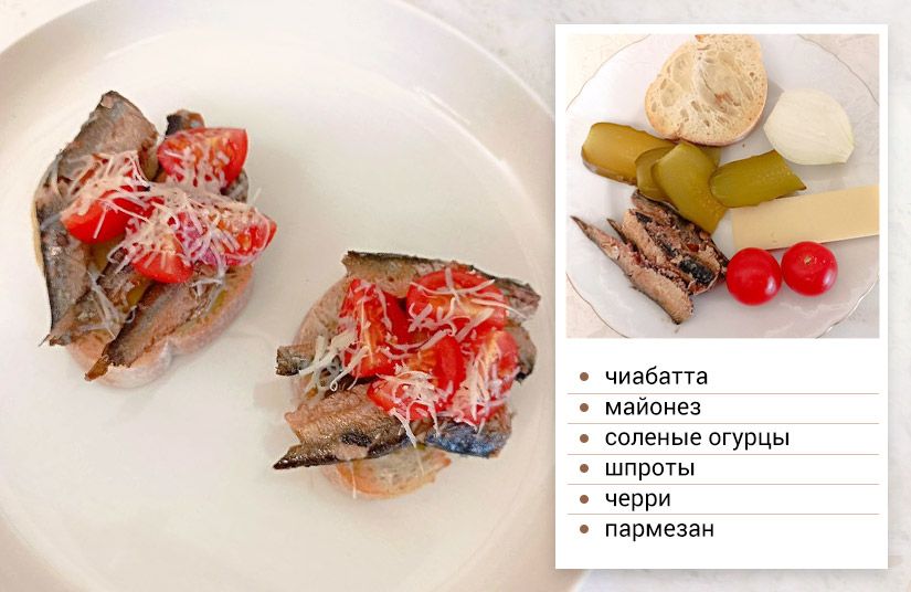 Тонким слоем намажьте майонез на подсушенный хлеб. Положите кружочки соленого огурца, затем шпроты, дольки помидоров. Сверху натрите пармезан и слегка запеките бутерброды в микроволновке, чтобы сыр подплавился.