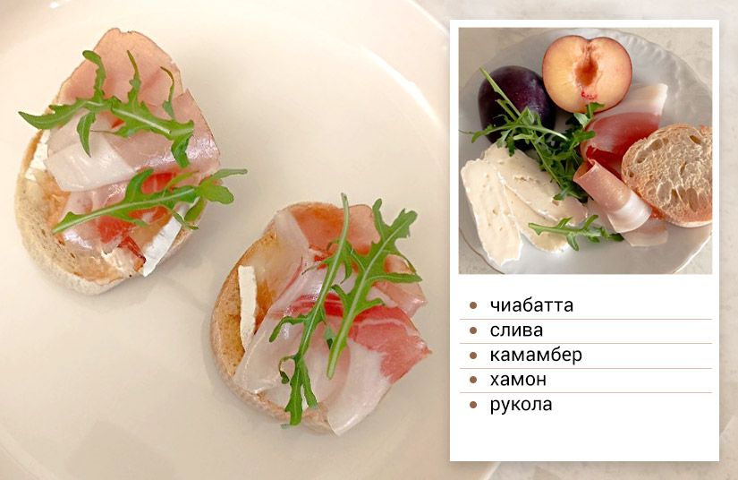 Вместо сливы можно взять персик или хурму, вместо хамона — прошутто. Камамбер можно заменить бри или любым сыром с белой плесенью.