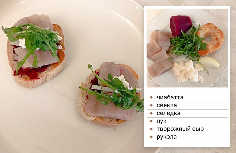 Отварите свеклу до готовности, остудите и натрите на мелкой терке. Выложите на подсушенный хлеб, сверху положите кусочки филе сельди, лук, добавьте руколу и для контраста — немного творожного сыра.
