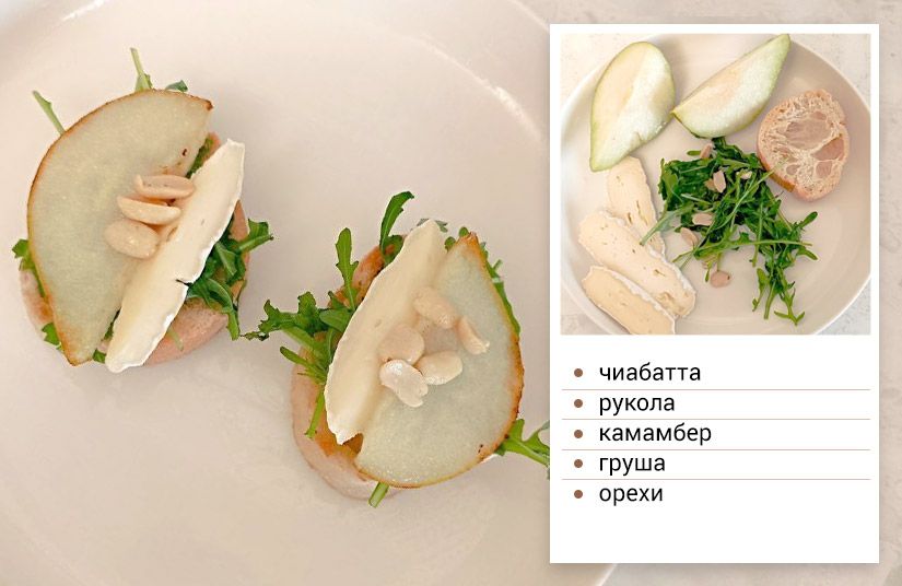 Нарежьте грушу тонкими ломтиками и обжарьте на сливочном масле до золотистой корочки. Выложите на подсушенную чиабатту руколу, теплую грушу, посыпьте орехами.