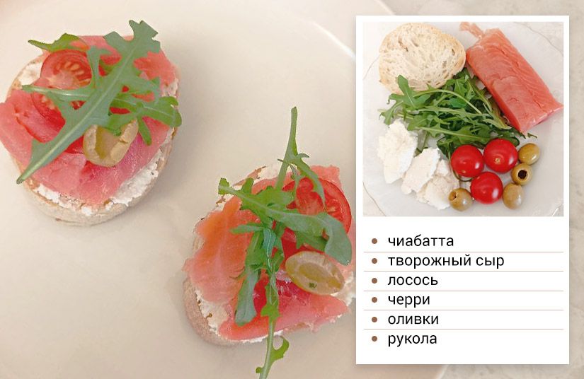 Намажьте подсушенную чиабатту толстым слоем творожного или сливочного сыра. Выложите ломтики лосося, добавьте кружочки оливок, черри и руколу.