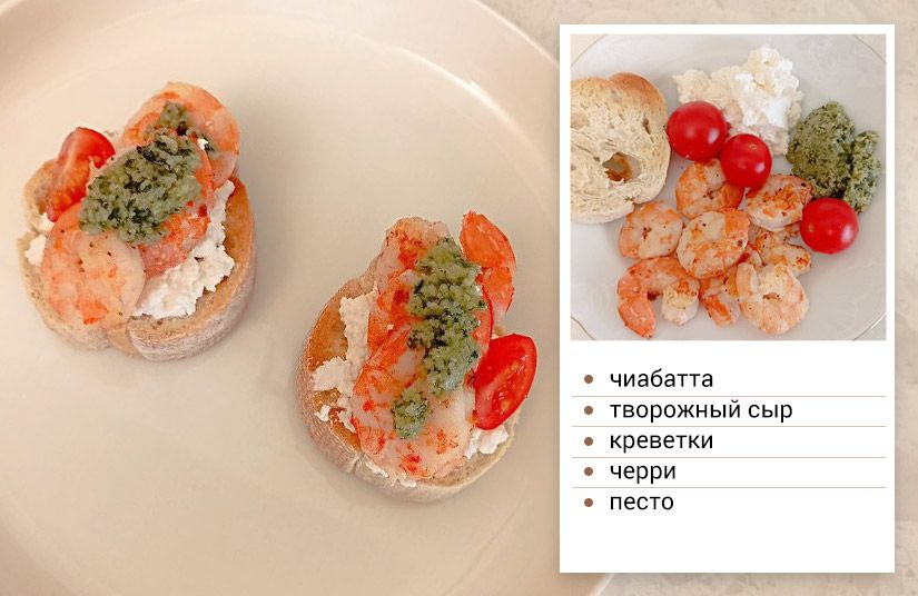Обжарьте креветки на сливочном масле по две минуты с каждой стороны. Намажьте подсушенную чиабатту сыром, выложите креветки, добавьте дольки черри, а сверху —песто.