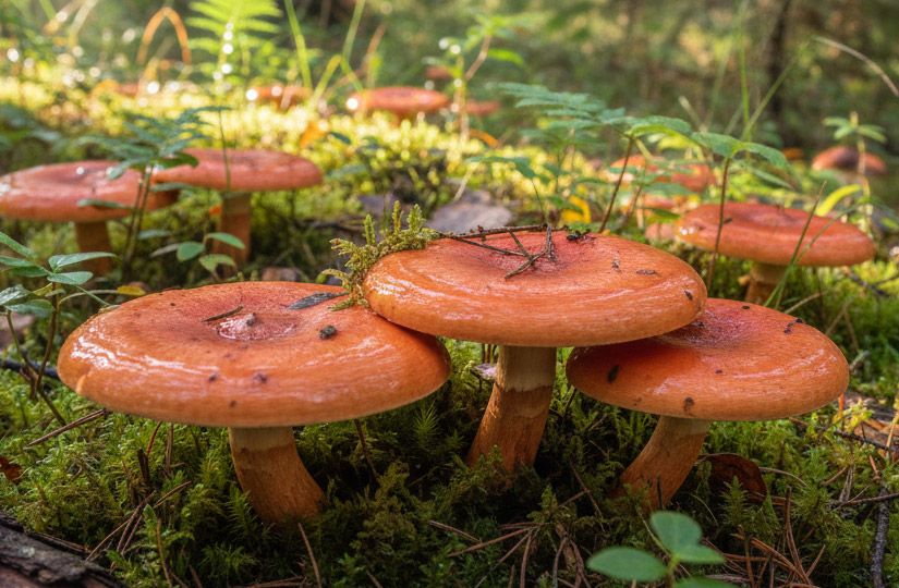 - Рыжики всегда растут кучно, прячутся от солнца и активно созревают после дождей.