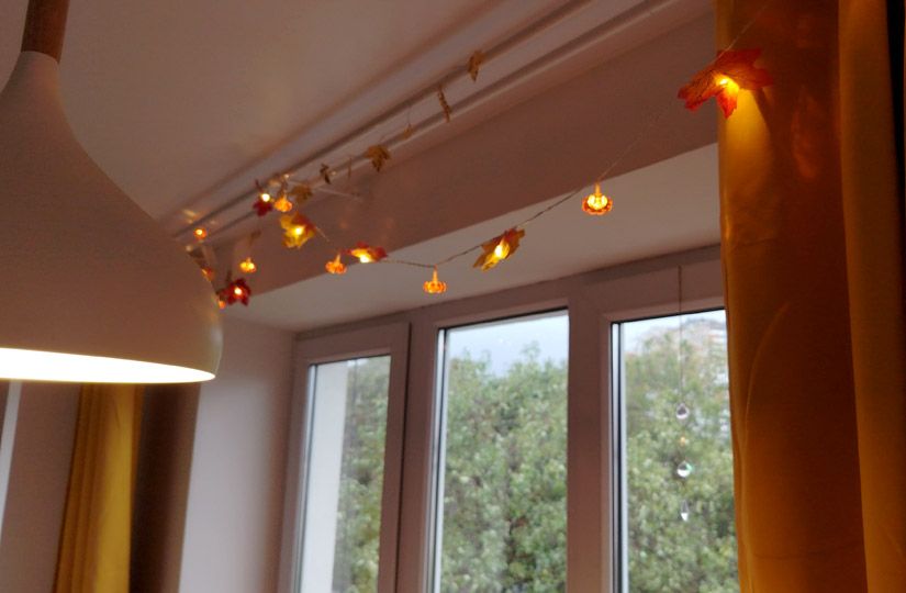 Использовать гирлянду с теплым светом, чтобы украсить кофейный уголок, комнатное растение, любимую картину, штору или фотографию.