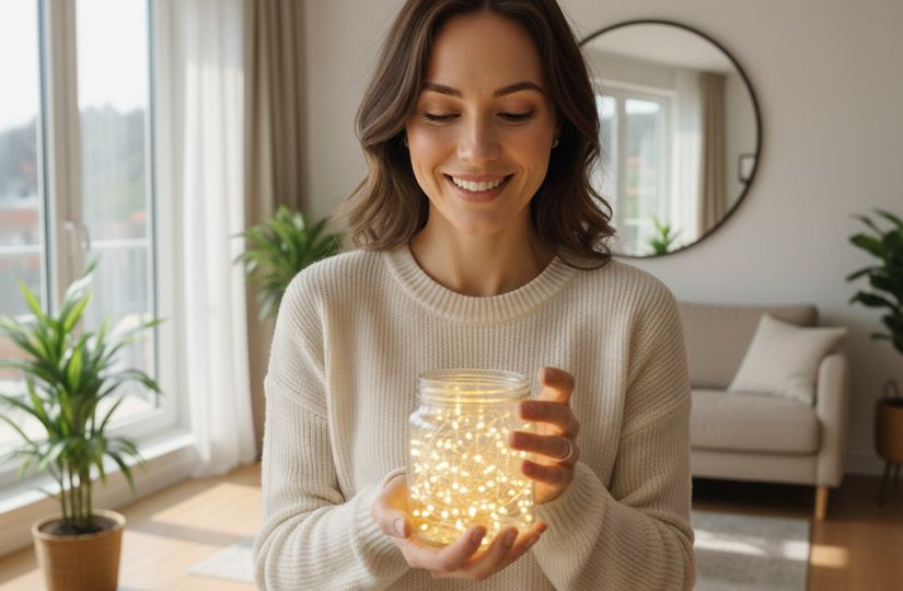 Создать композицию из гирлянды и свечей в стеклянных сосудах. Получится невероятно уютный уголок.