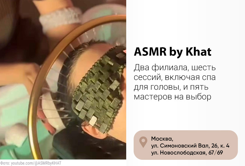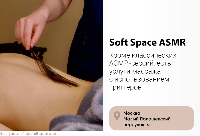 Это совсем небольшие студии, в которых не оказывают других услуг. Ассортимент сессий плюс-минус одинаковый: расчесывание волос, массаж со скребком гуаша, поглаживание перышками и кисточками, имитация сборов на вечеринку, замеров и медицинских осмотров. Разумеется, процедуры проходят при приглушенном свете, под приятную тихую музыку и шепот — все как в любимых видео.