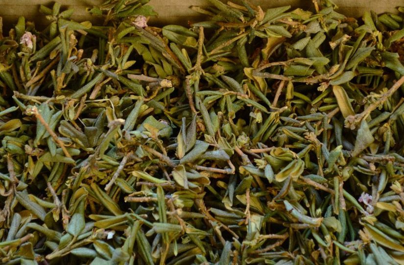 - естественная скрутка листьев — игольчатой формы, цвет — от зеленого до светло-коричневого (темно-коричневый цвет говорит о том, что сбор старый);
