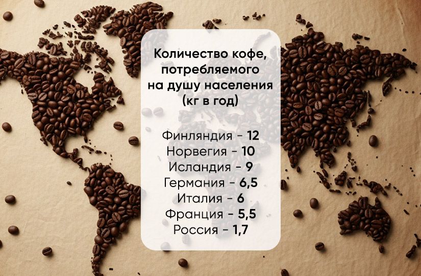 А что если сравнить Россию с другими странами. По объемам продаж на данный момент мы входим в пятерку самых крупных мировых покупателей кофе, но если вспомнить про численность населения и поделить количество употребленного кофе на всех, то в сухом остатке получается не более 1.7 кг на человека в год. Для сравнения, в Финляндии это... 12 кг! На втором месте стоит Норвегия (около 10 кг), на третьем – Исландия (9 кг). Немцы «выпивают» около 6.5 кг в год на человека, итальянцы – 6 кг, французы – 5.5 кг. Россия, как видите, даже не вошла в топ-20 мирового потребления кофе.