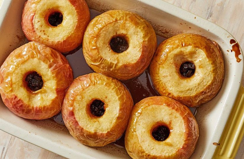 - Яблоки с кожурой разрежьте пополам, выньте сердцевину с косточками, запеките в духовке.