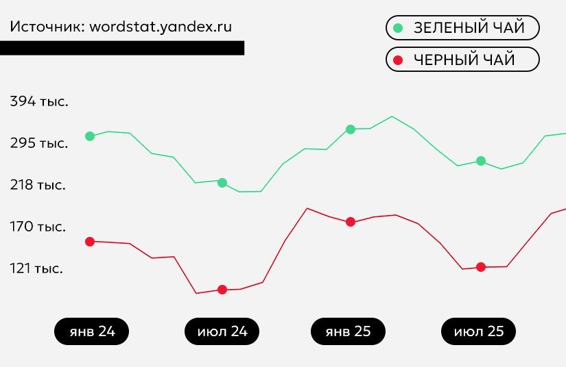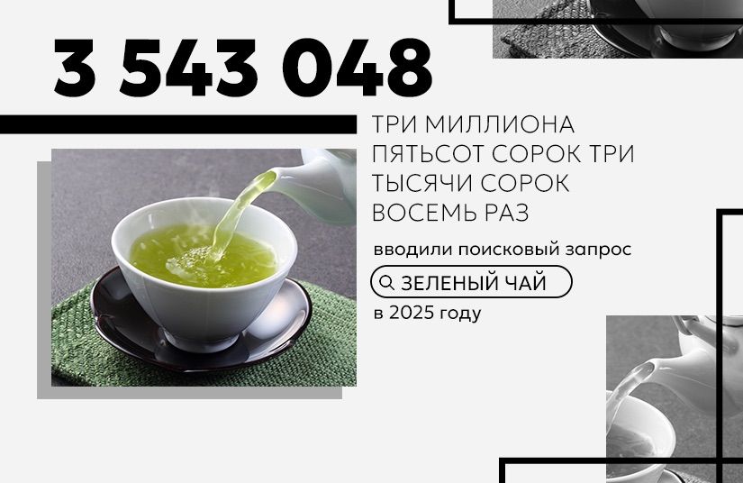 В России отдают предпочтение черному чаю. По данным компании «МАЙ», за 2023 год этот напиток регулярно пили 76% опрошенных, а зеленый — только 36%. В 2025 году это соотношение принципиально не поменялось, но поисковики выдали совсем другую картину: если «черный чай» искали 2 072 595 раз, то «зеленый чай» — в полтора раза чаще.