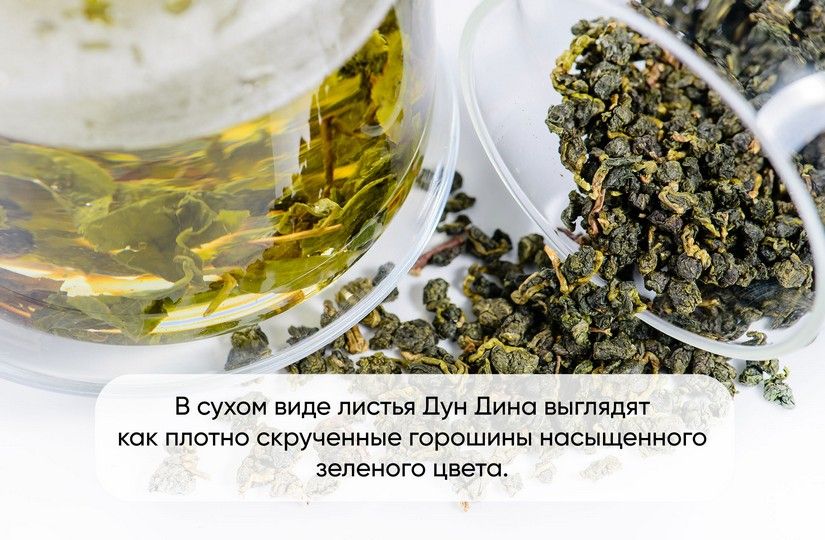 В сухом виде листья Дун Дина выглядят как плотно скрученные горошины насыщенного зеленого цвета. Они имеют цветочно-травянистый, немного маслянистый аромат с ванильным фоном.
