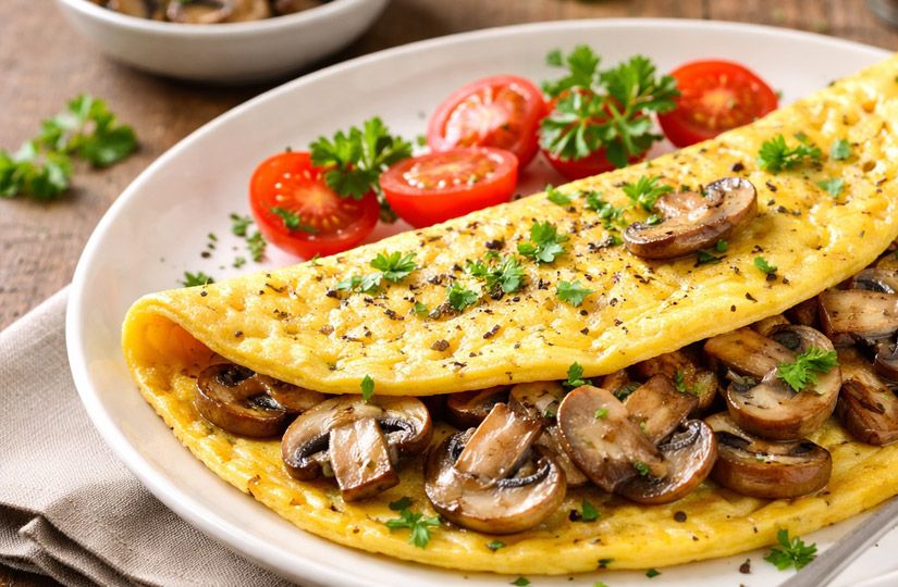 - Белковый омлет с грибами и кусочек хлеба.