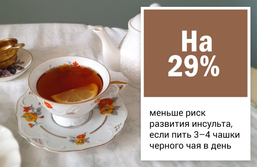 Международное исследование Interstroke (типа «случай — контроль») проанализировало данные 27 000 человек из 32 стран [3]. Ученые сравнили людей, перенесших инсульт впервые, со здоровыми участниками и скорректировали результаты с учетом питания, курения и физической активности. Оказалось, что три-четыре чашки черного чая в день связаны с 29% снижением риска инсульта. Такая закономерность оказалась общей для людей по всему миру — от Ирландии до ЮАР и Китая.