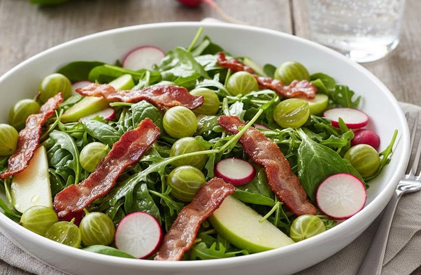 Этот настоящий взрыв вкусов. Кислинка крыжовника оттеняет соленость бекона, а хрустящие овощи добавляют свежести.
